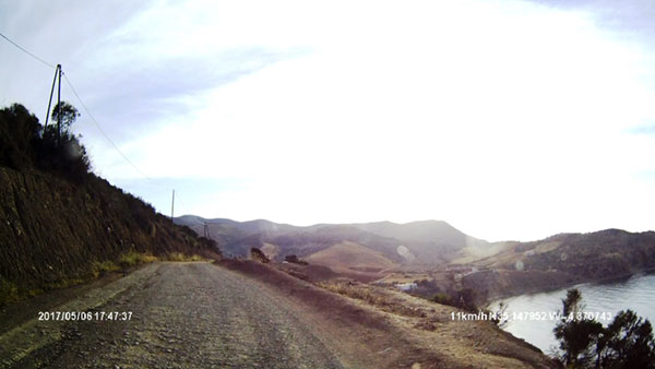 Gefrühstückt und dann weiter gefahren; immer der N 16 entlang; hier treffen wir auf Steine werfende Kinder nachdem wir