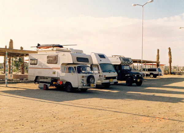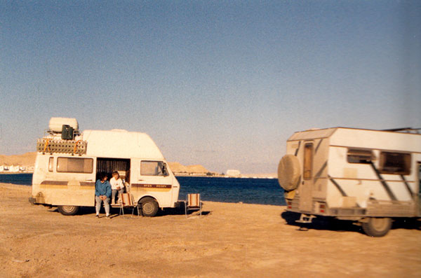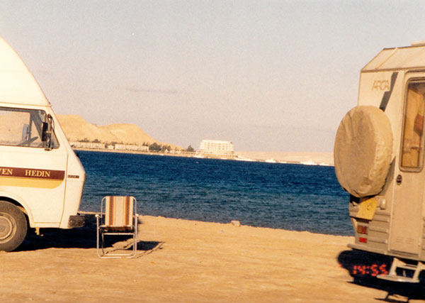 05.01.1989 am Strand von Hurghada; wir können direkt am Strand stehen und übernachten; außer dem Rundbau des Sheraton Hotels
