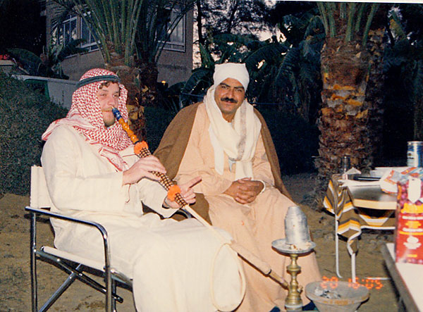 20.12.1988 Ankunft auf dem SaharaMar Campingplatz von Amer Abas in Gizeh; zu meinem Geburtstag bekam ich von Amer eine Gallabia sowie eine traditionelle Kopfbedeckung geschenkt und mußte mit ihm eine Wasserpfeife (Shisa) rauchen; am Abend dann alle Mann in unseren Sven Hedin und kräftig meinen Geburtstag gefeiert.