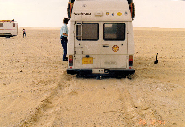 Farafra; wir verlassen die Teerstraße Richtung Dünen und stecken nach wenigen km mit unserem VW-LT fest; Schaufel raus und
