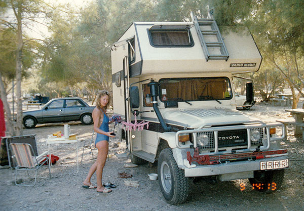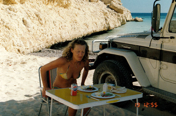 25.11.1989 : in der Wüste übernachtet; Franzi und "Pampa Conny" aus Freyung/Grafenau mit Landcruiser getroffen die schon seit Tagen