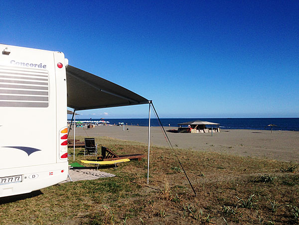 Platz liegt direkt am Sandstrand und bietet uns einen Stellplatz in erster Reihe und unverbauter Meersicht; der Platz ist einfach