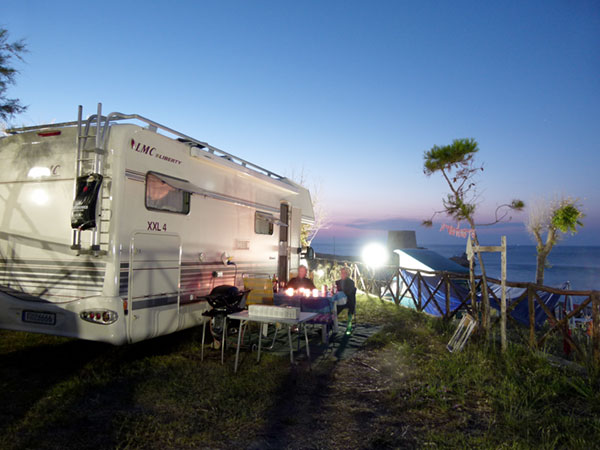 Wir fahren Richtung Acciaroli und finden kurz vor dem Ort rechts, den Area Sosta Camper Lido Giu-Gio wo wir für 10,-- €/Nacht