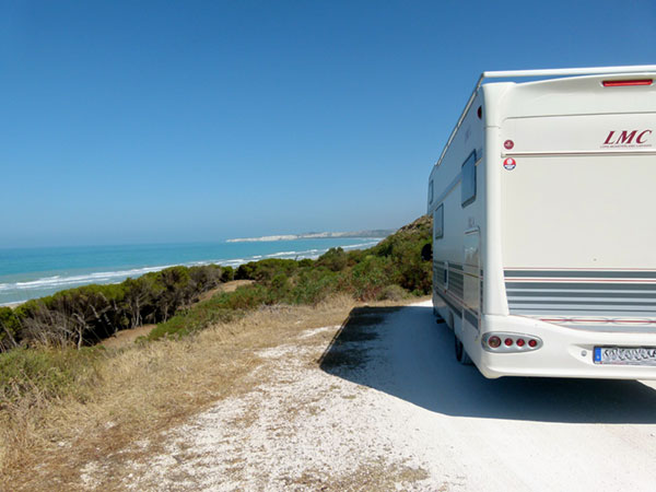 über die ca. 3 km lange Privatstraße bis zum Wohnmobilstellplatz, direkt am kilometerlangen, fast menschenleeren, Sandstrand