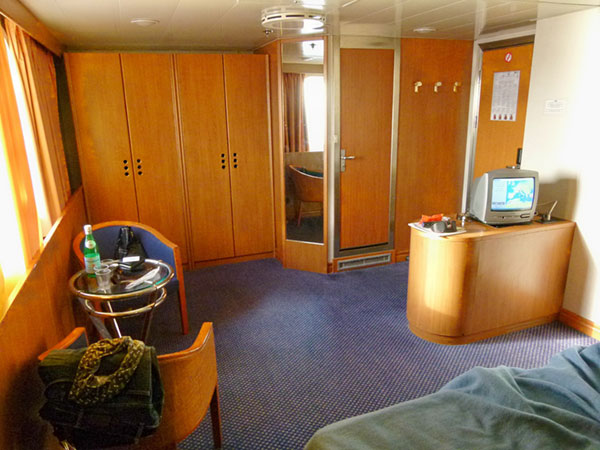 (wie soll das funktionieren ???). Dafür haben wir eine sehr schöne, geräumige Außenkabine mit Dusche, WC und TV und können