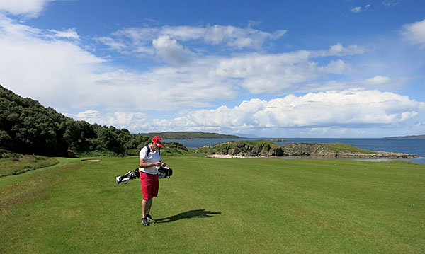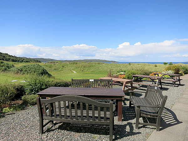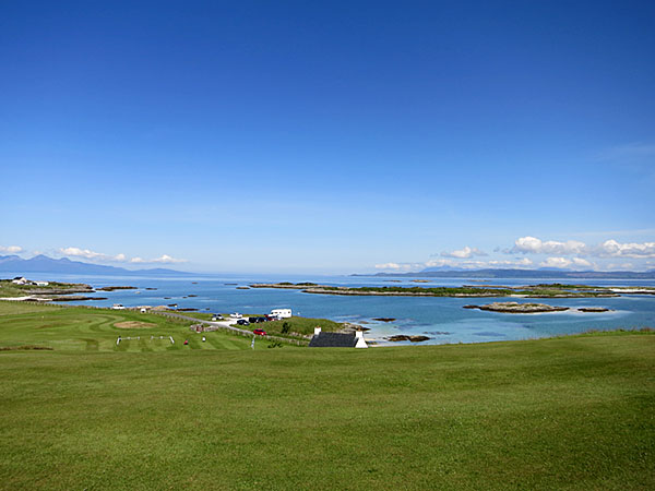 Für 20 Pfund/Person Greenfee können wir spielen. Der Platz ist hügelig und hat traumhafte Ausblicke auf die Bucht und die Isle of Skye.