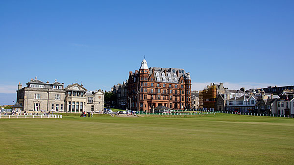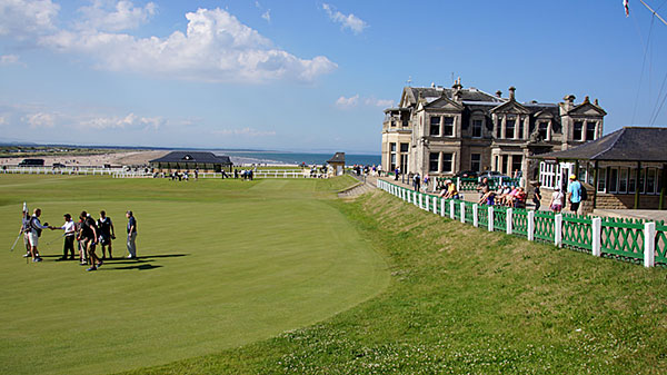 altehrwürdigen Clubhaus hoch, die Bags auf dem Rücken. Der 10 Min. lange Weg führt uns direkt über die Bahnen. Wir können