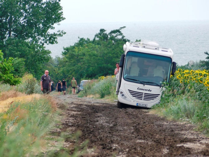 zusammengepackt, bezahlt (55,-- €/Person für die Bootsfahrt und 20,-- € für den Platz) und der Schwarzmeerküste entlang bis an die bulgarische Grenze gefahren, wir kamen dann bis Vama Vecche einem etwas ausgeflippten Hippie-Ort mit zahlreichen Rockkneipen und Fischlokalen am Strand; dort wurden wir dann von einer sehr gut deutsch sprechenden Frau angesprochen die uns eine Campingmöglichkeit in Ihrem Grundstück mit Meerblick angeboten hatte, weil die Campingplätze alle kpl. voll waren; dies haben wir gerne angenommen; gingen dann gemeinsam am Strand zum Essen; die Nacht war allerdings grauenvoll (laute Musik bis 04.00 Uhr, danach lauter zugedröhnte Leute am Strand u. vor dem Grundstück); haben ganz schlecht geschlafen; der Ort selbst ist aber sehenswert ! SAT-Antenne geht nicht mehr ! Wahrscheinlich Kabelbruch in der Dreheinheit !