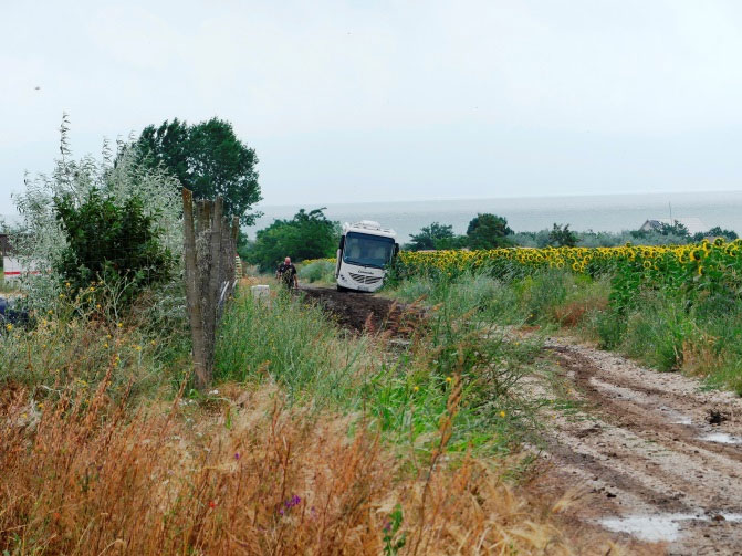 Ausgecheckt 10,-- €/Nacht bezahlt und von Cristian noch Anweisungen bekommen, welchen Weg wir bis zur Hauptstraße fahren sollen; wir kamen ca. 500 m weit und dann kam eine total aufgeweichte ca. 300 m lange Matschstrecke; ich bin die zuerst abgelaufen und kam zum Entschluss das packen wir nicht; Günther meinte das packen wir locker; ich bin dann mit Ach und Krach u. Differenzialsperre gerade noch so durchgekommen; Günther schaffte nur ein paar Meter danach war im Graben Schluss; Karin hat dann über den Cristian einen Traktor organisiert der Günther herausgezogen hat; hat 100 Lei und einen halben Tag gekostet;