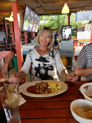 Nach der Rückkehr, noch etwas ausgeruht und am Abend dann zum Fischer zum Essen gegangen der bequem zu Fuß erreicht werden konnte; lecker gegessen u. getrunken (hausgemachten Wein); Fischsuppe, gebackene Karpfenfilets ohne Gräten und gebackenen Wels sowie Polenta dazu Knobi-Creme; danach hausgemachte Pfannkuchen; es war so viel, dass wir nicht alles geschafft haben; abschließend noch etwas vor dem WoMo gesessen; an diesem Abend ging unsere SAT-Antenne noch